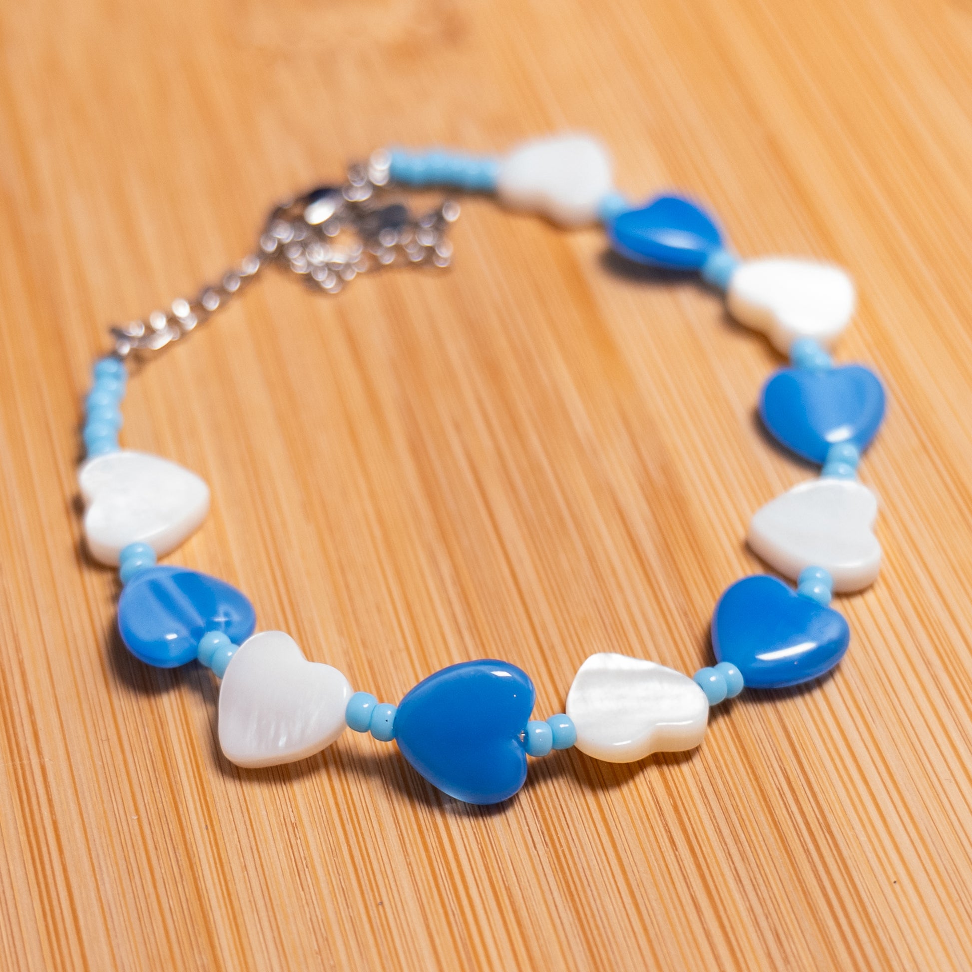 Laat je hart sneller kloppen met de "Blue Heart" armband uit onze Ocean Glow collectie. Deze charmante armband is een liefdevolle ode aan de zee, versierd met afwisselend helderblauwe glaskralen en witte schelpkralen. Tussen de harten zijn kleine, lichtblauwe accentkraaltjes verwerkt, wat zorgt voor een speels en verfijnd effect.