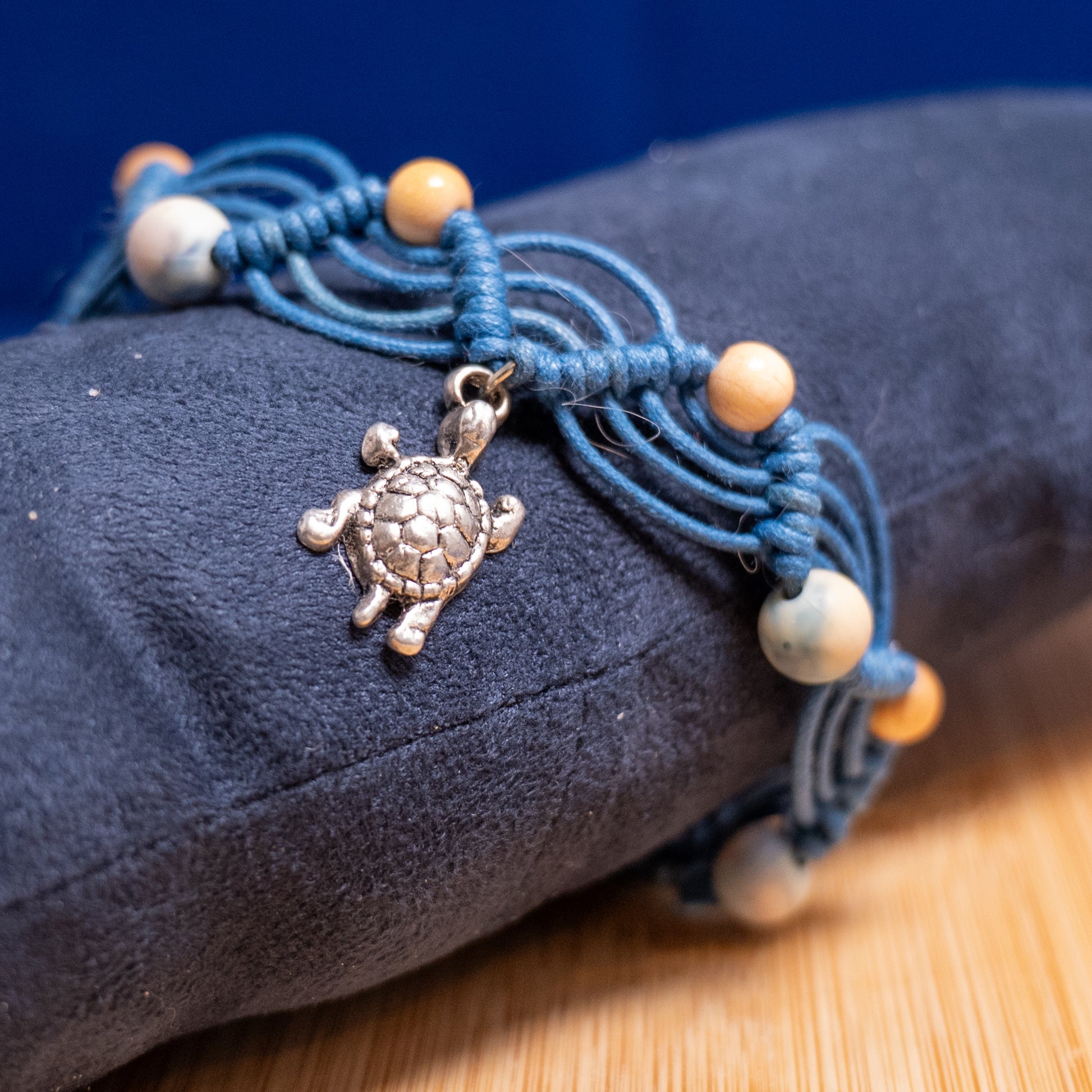 Deze armband is gemaakt van een stevig blauw waxkoord, geknoopt in een prachtig golvend patroon dat de beweging van de oceaan weerspiegelt. Tussen de "golven" zijn afwisselen natuurlijke houten kralen en lichtblauw gemêleerde kralen verwerkt, die de strandzand en zeeschelpen symboliseren. Het middelpunt van de armband is een zilverkleurige schildpad, een symbool van duurzaamheid en een link naar het mariene leven.