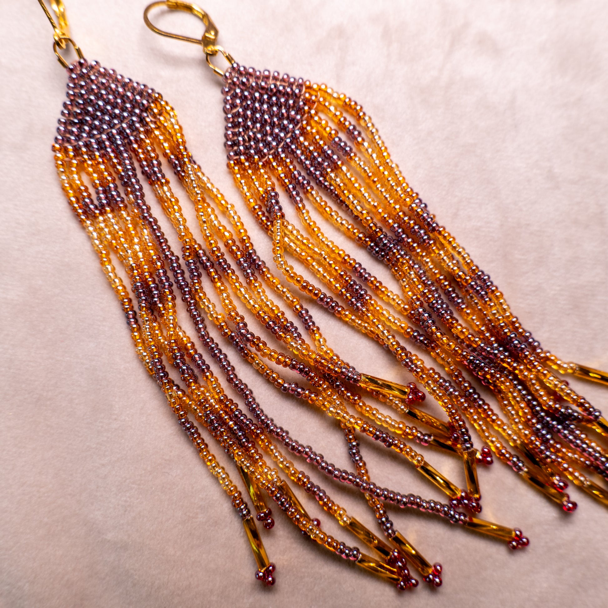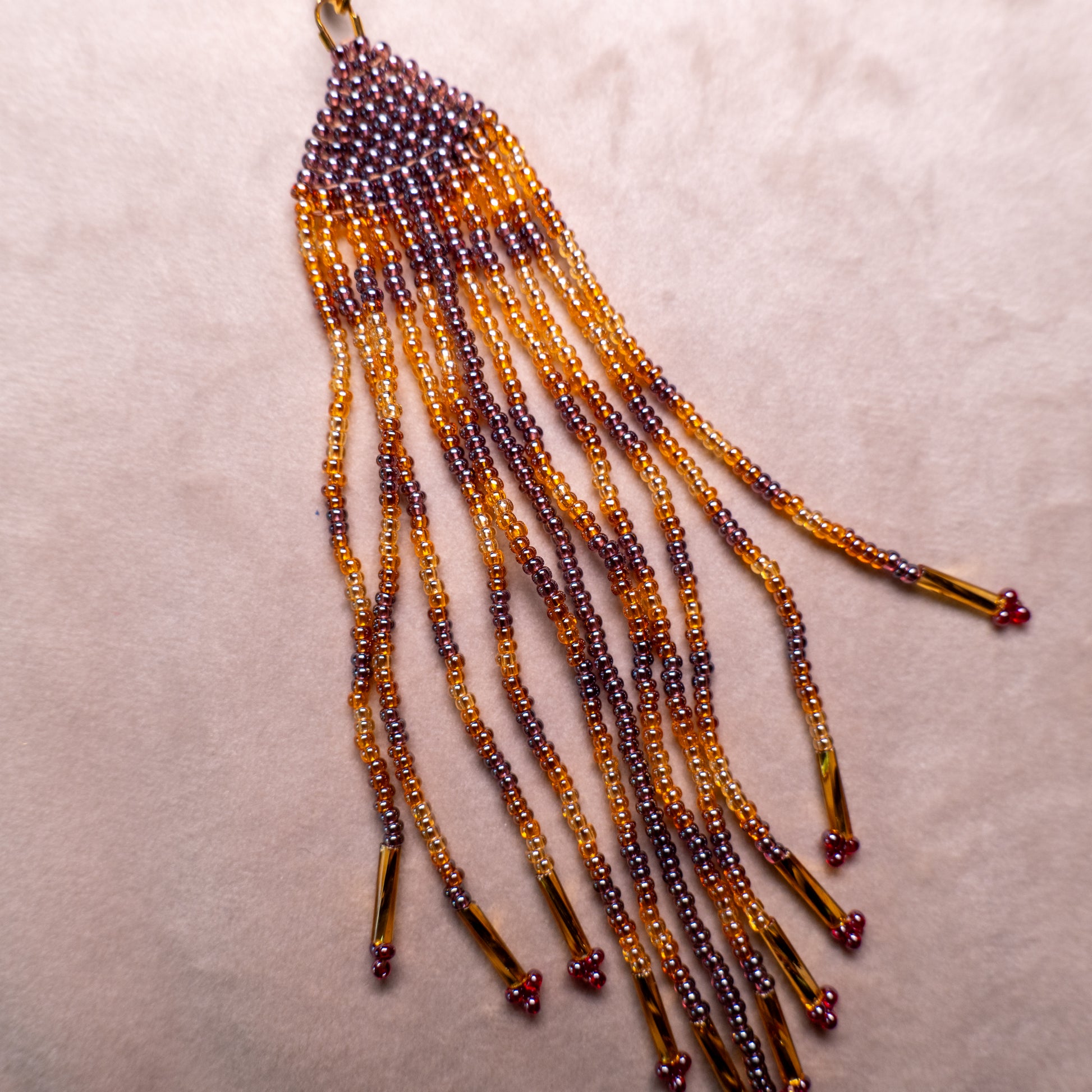 Deze lange fringe oorbellen vangen het licht én de aandacht. Ze zijn handgeweven met glanzende rocailles in warme, gelaagde kleuren: van honinggeel tot pruimpaars. In het midden van het patroon zit een subtiel herfstblad verwerkt, met bruine nerven die zich net zichtbaar aftekenen tussen de warme kleuren. De soepele franje beweegt sierlijk mee en geeft het geheel een levendig karakter. Een elegante eyecatcher met diepte.