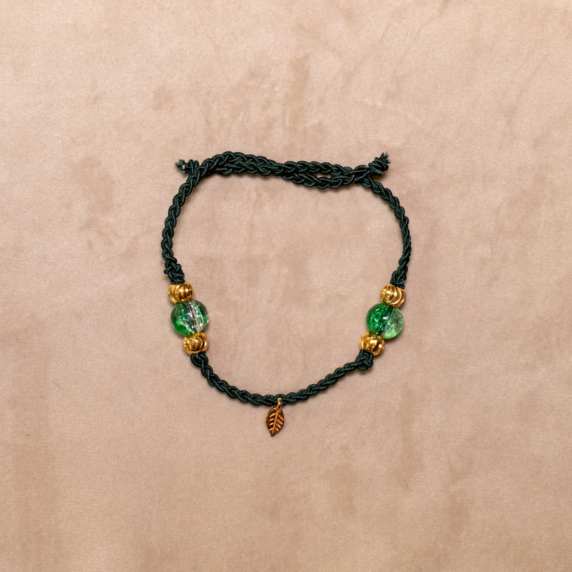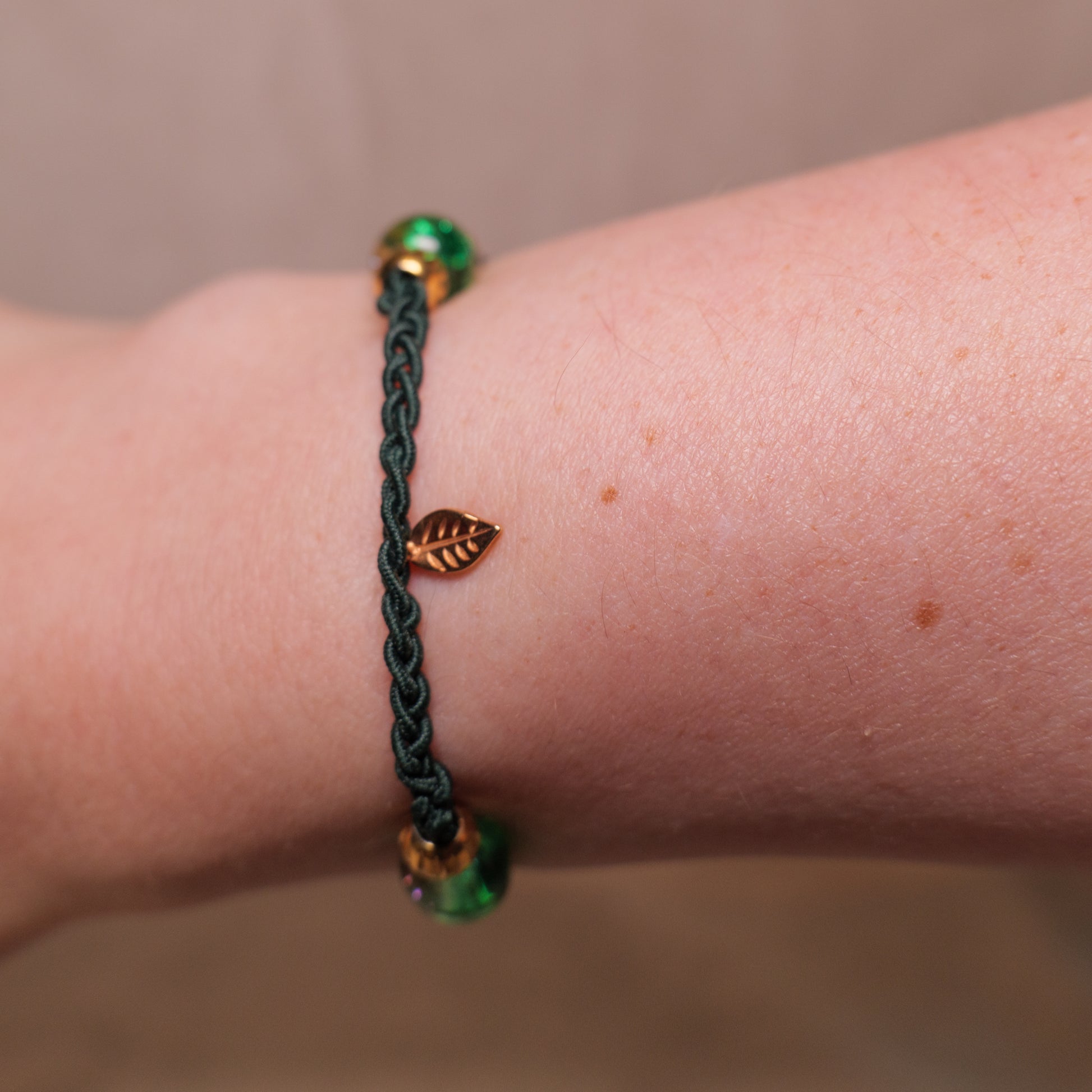 De combinatie van gevlochten draad, glas en metaal maakt deze armband zowel stoer als verfijnd. De half-transparante kralen zorgen voor lichtval en diepte, terwijl het blaadje verwijst naar herfstige wandelingen in het bos. Draag hem solo of combineer hem met andere armbanden voor een gelaagd effect.