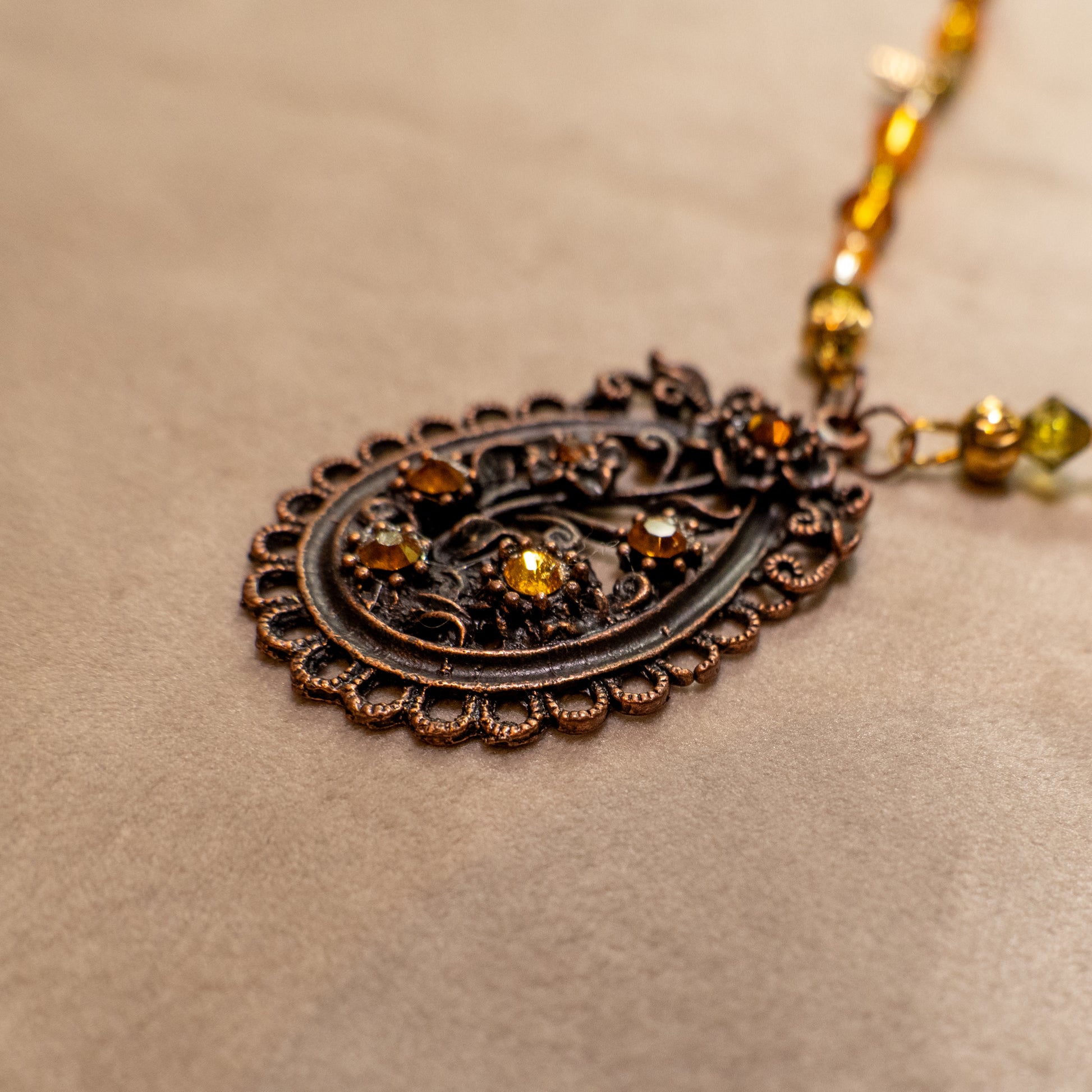 Ketting met antiek koper bloemenornament en amberkleurige facetkralen