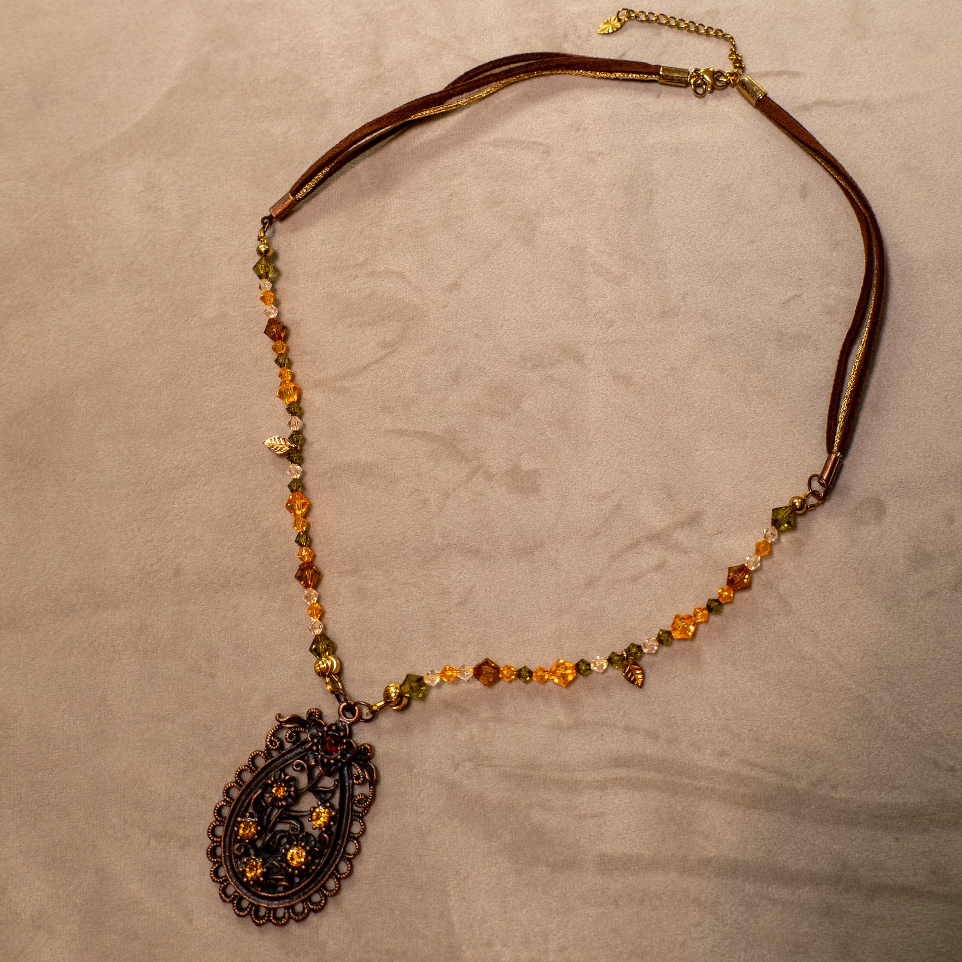 Deze ketting straalt de warmte van de herfst uit, met een sierlijk bloemenornament in antiek koper als stralend middelpunt. De amberkleurige facetkralen en sprankelende strassstenen laten het ontwerp glinsteren, terwijl de combinatie van koper, goud en bruin zorgt voor een elegante harmonie. Een statement piece dat opvalt, maar toch subtiel verfijnd blijft.