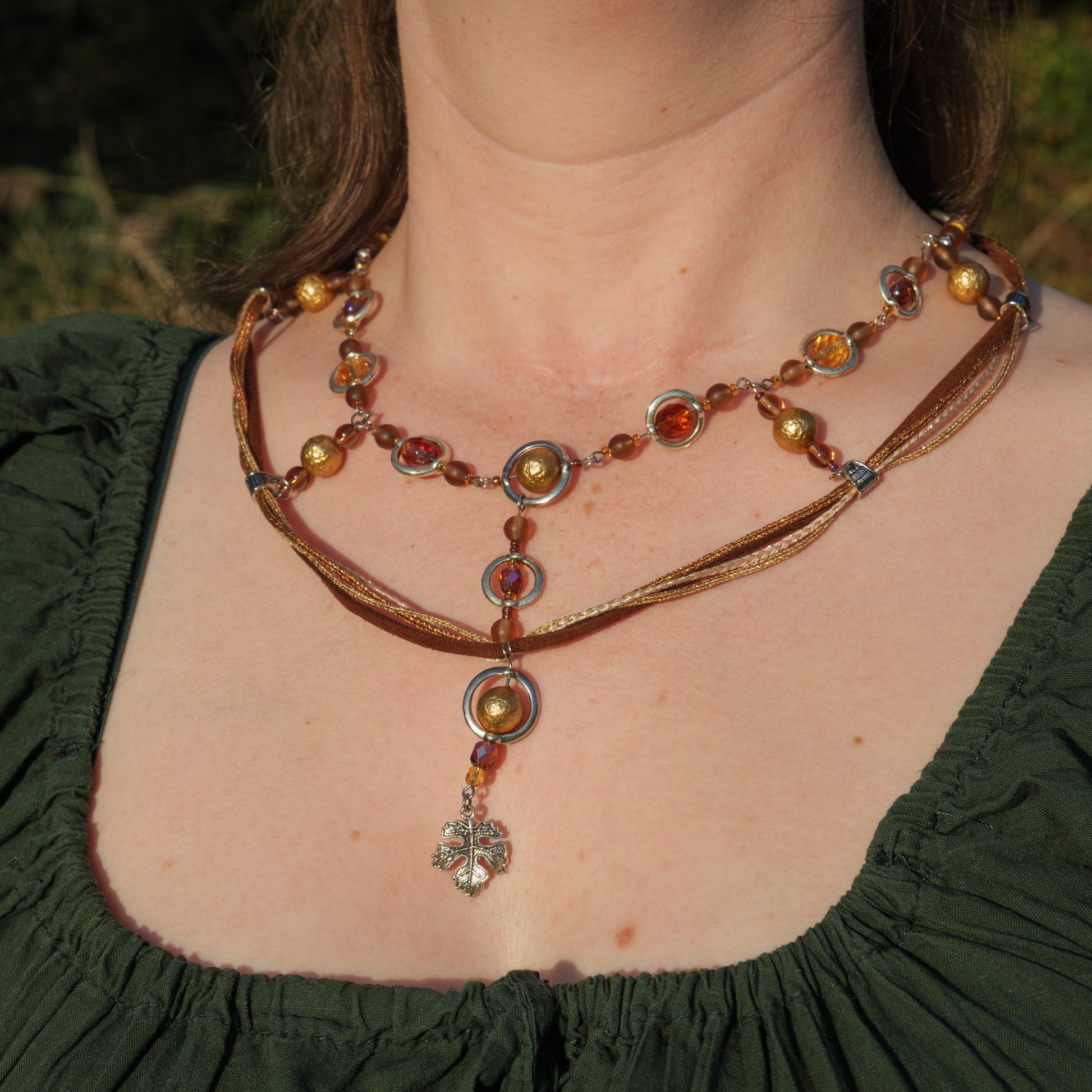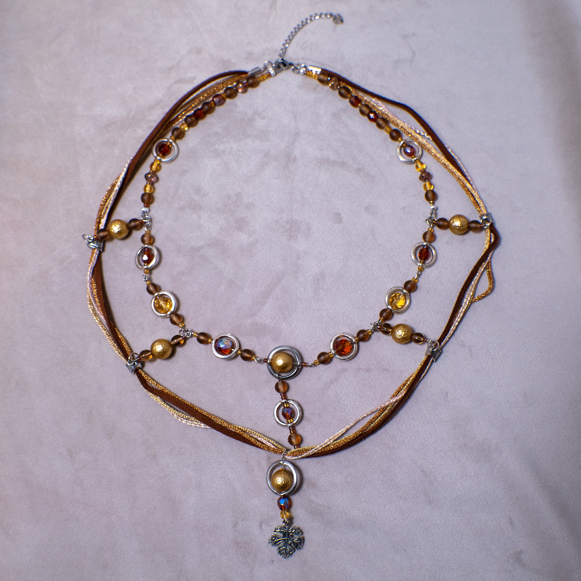 Deze one-of-a-kind ketting combineert warme herfsttinten met een uniek verhaal. Elk onderdeel is zorgvuldig gekozen en samen vormt het een sieraad dat je nergens anders vindt.