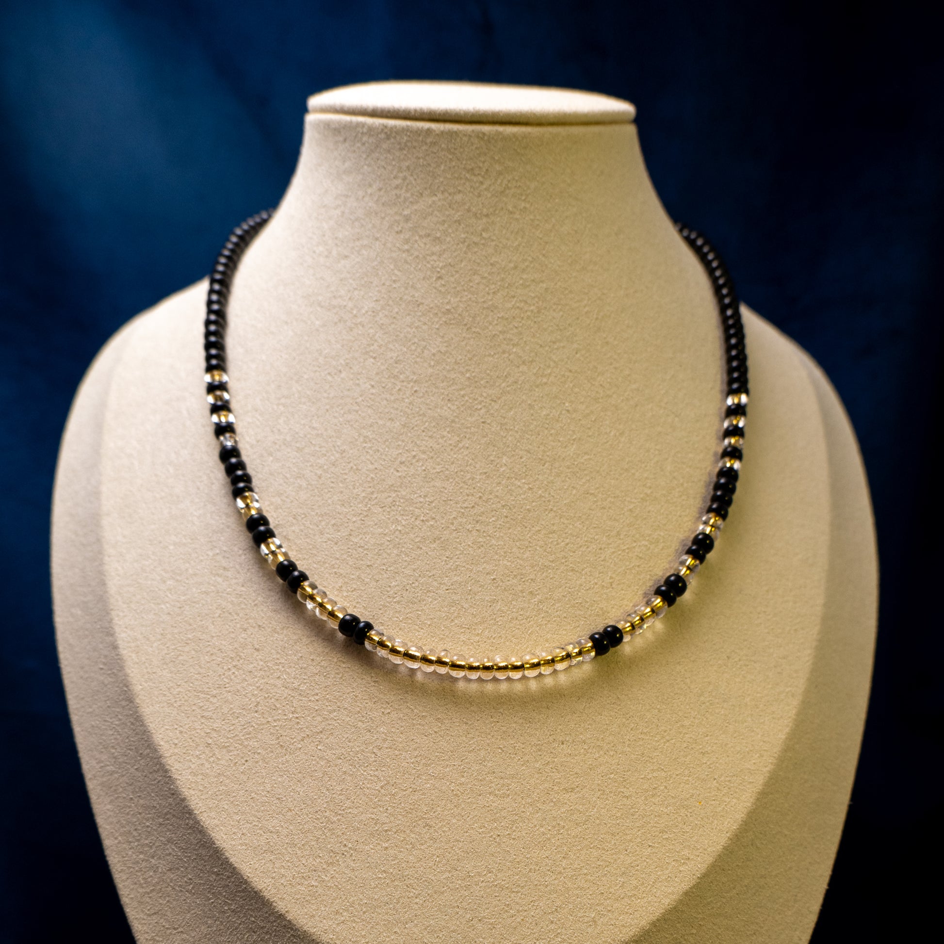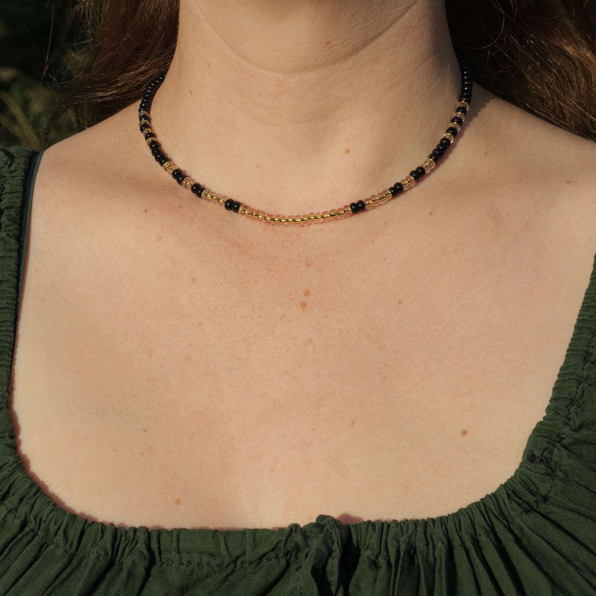 Ketting met mat zwarte rocailles en transparante kralen met gele kern