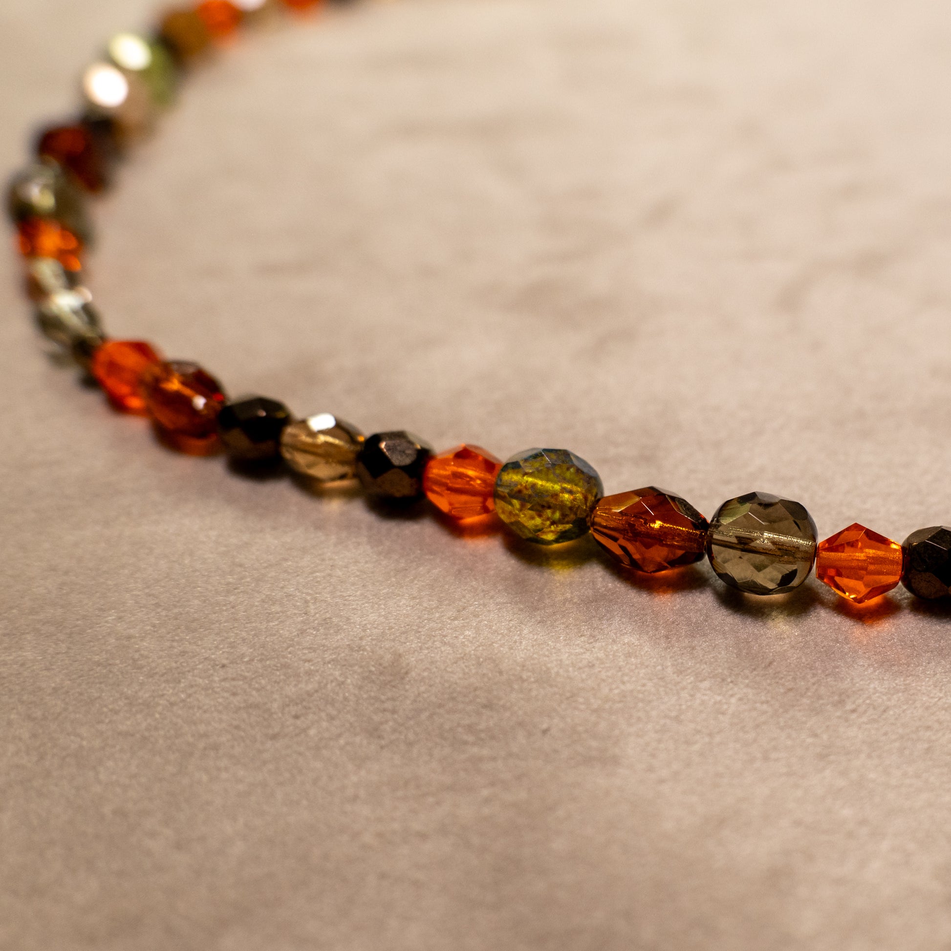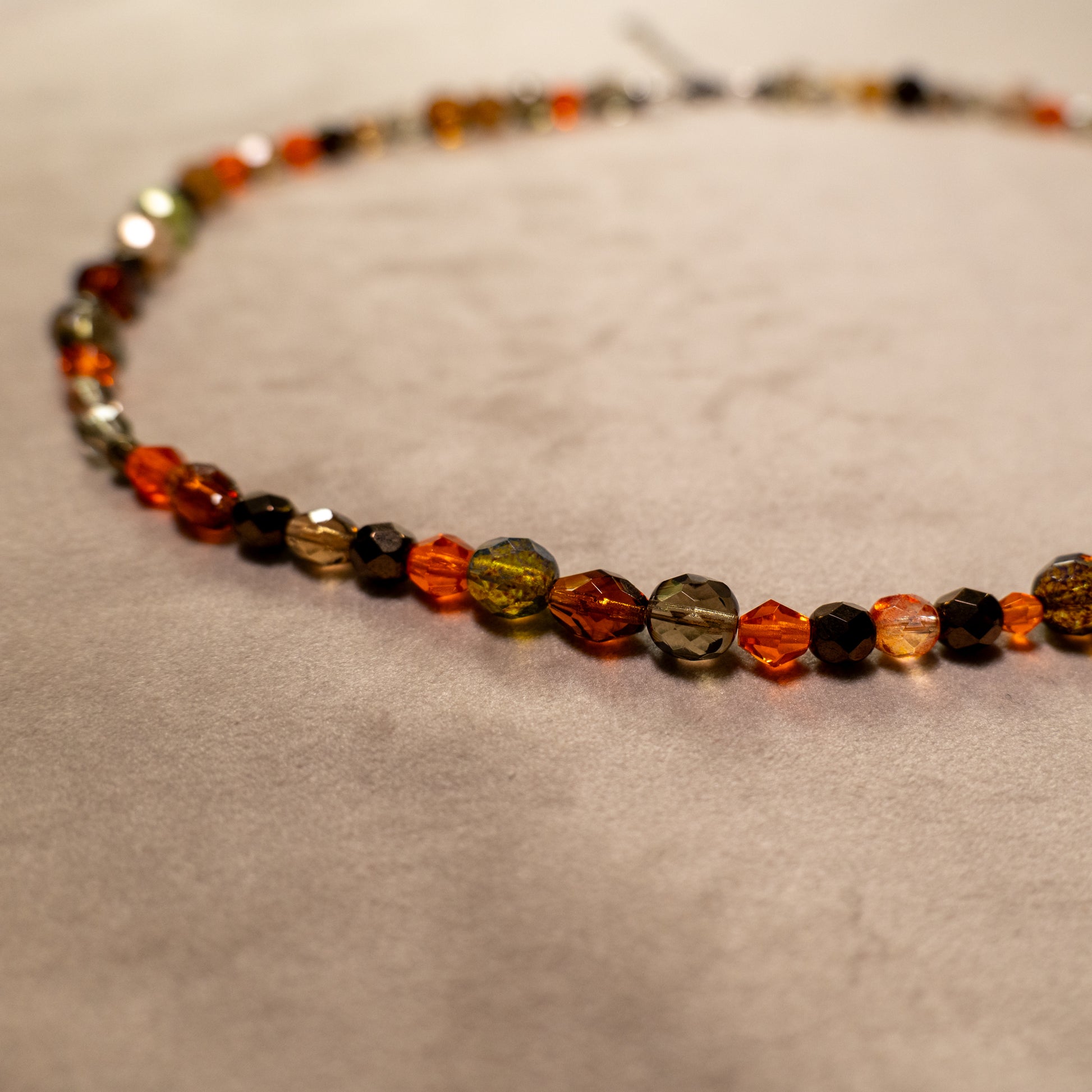De kleuren van de ketting doen denken aan een boswandeling in de late namiddag in de herfst. Het oranje licht dat door de bomen valt, de glans van vochtige bladeren, het gevoel van rust en warmte. De kralen zijn zorgvuldig gekozen en geregen in een ritme dat natuurlijk aanvoelt, zonder strikte symmetrie. Ideaal voor wie houdt van warme kleuren en sieraden passend bij de herfst.