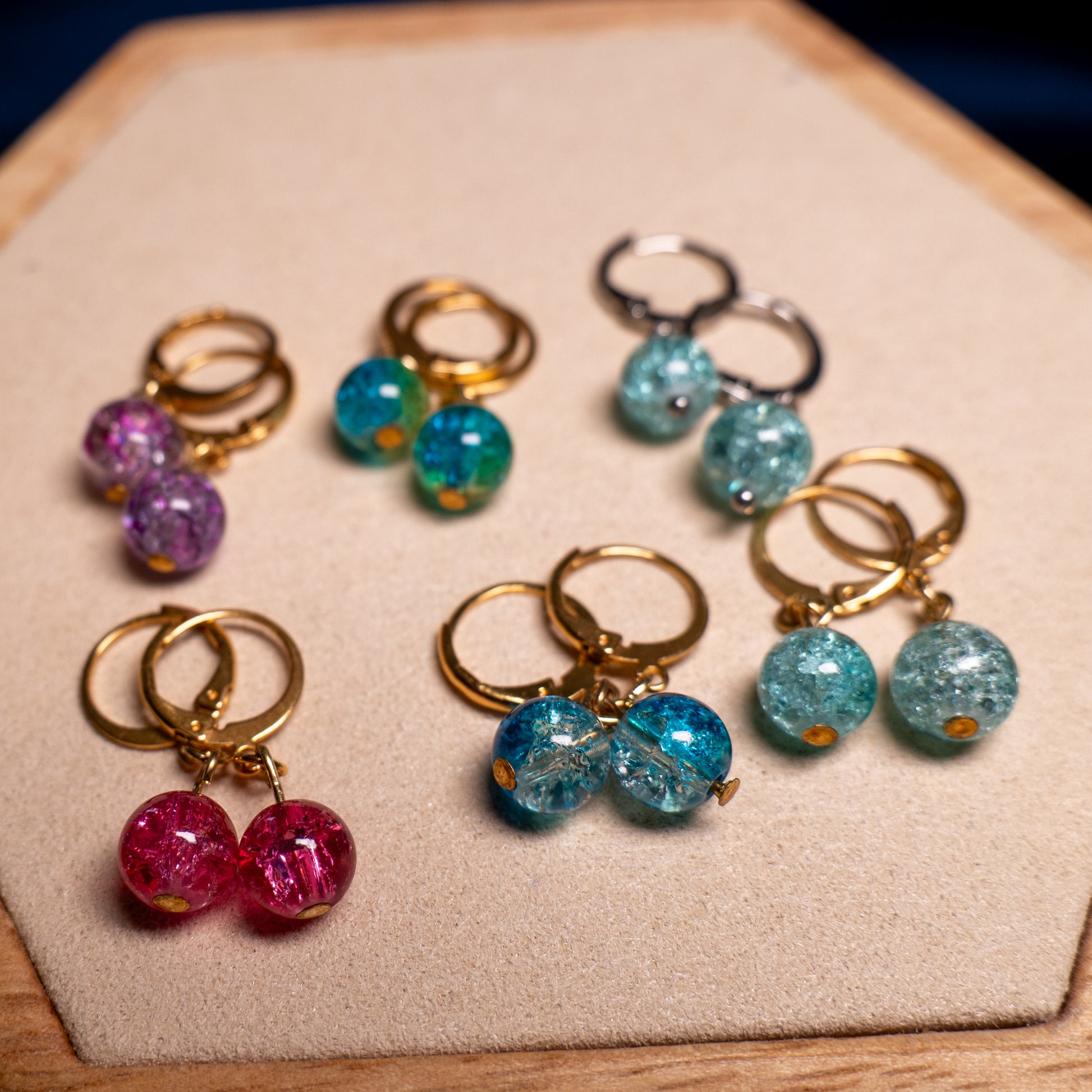 Deze kleine oorbellen bestaan uit craquelé glaskralen van 8 mm, bevestigd aan een fijn ringvormig oorbelletje. Door het lichte gewicht en de gladde afwerking zijn ze prettig om dagelijks te dragen.