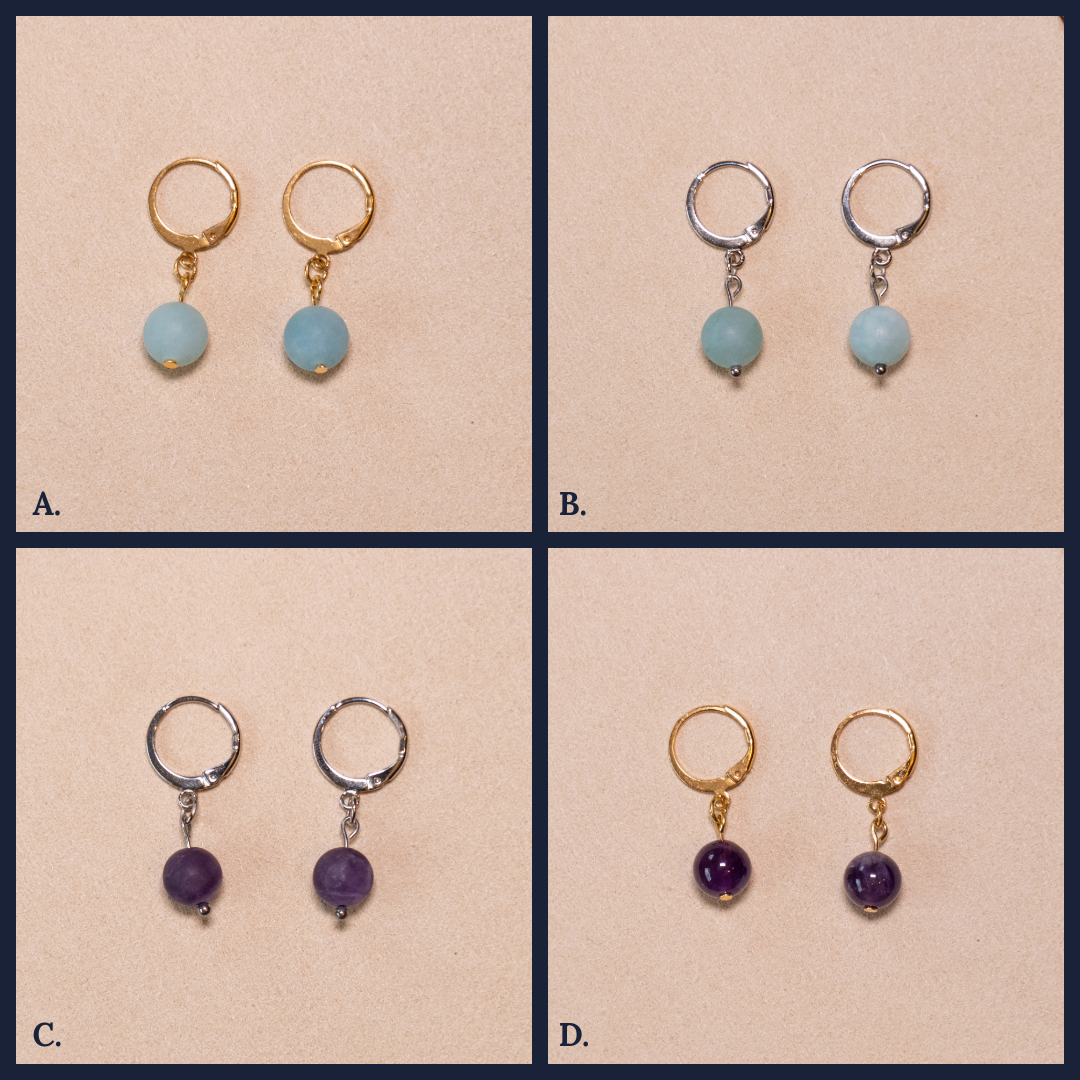 De oorbellen zijn verkrijgbaar in vier varianten. Elke variant verschilt in steensoort en metaalafwerking, maar de vorm en het draagcomfort zijn gelijk.
