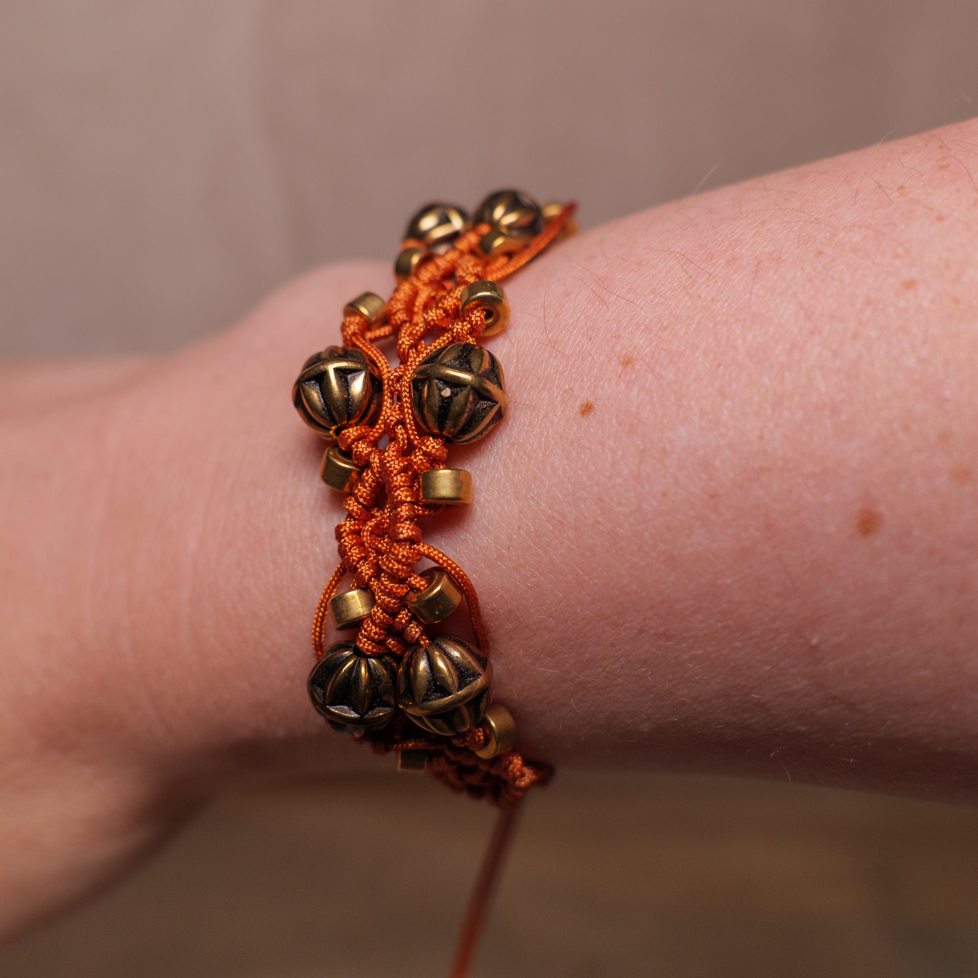Deze armband is met zorg geknoopt in de macramé-techniek, waarbij koperkleurig draad een warme basis vormt voor goudkleurige kralen. Dankzij de verstelbare sluiting past de armband comfortabel om vrijwel elke pols. Het resultaat is een stijlvol en subtiel sieraad dat gemakkelijk combineert met andere accessoires. Doordat er slechts twee exemplaren zijn gemaakt, draag je een uniek sieraad dat in kleine oplage bestaat.