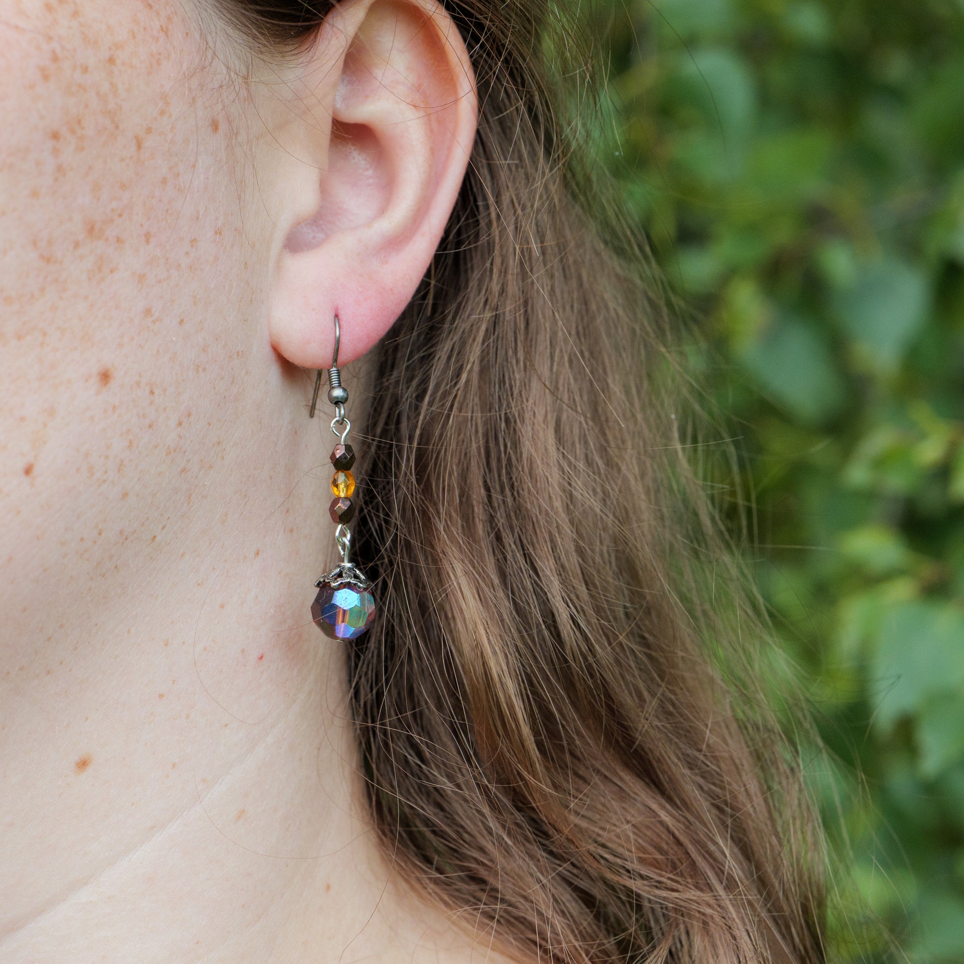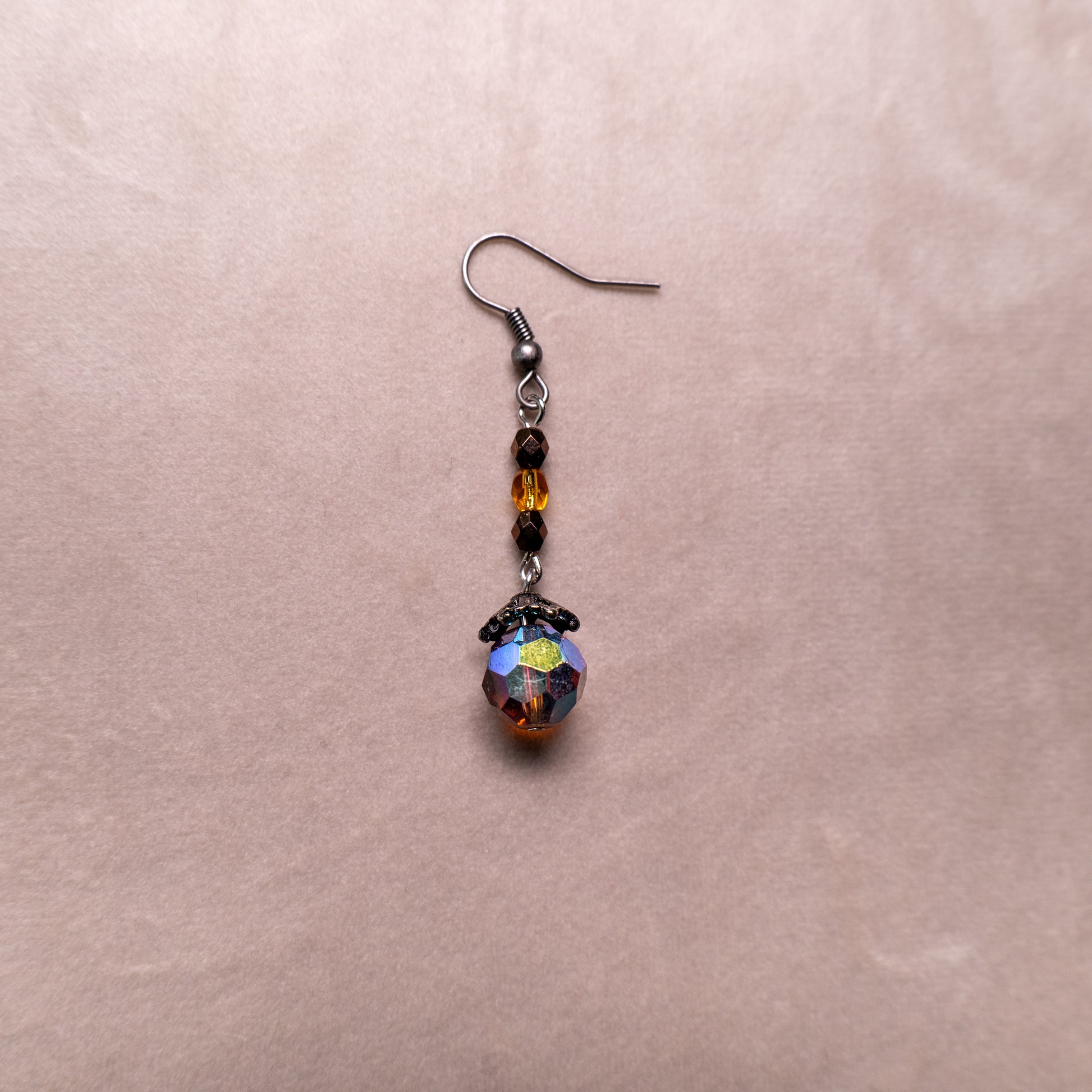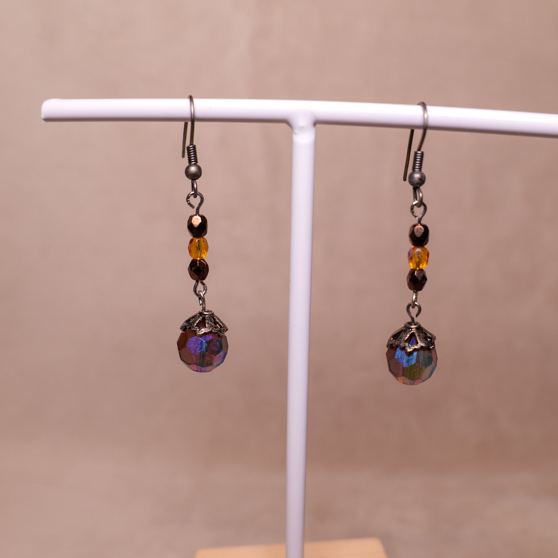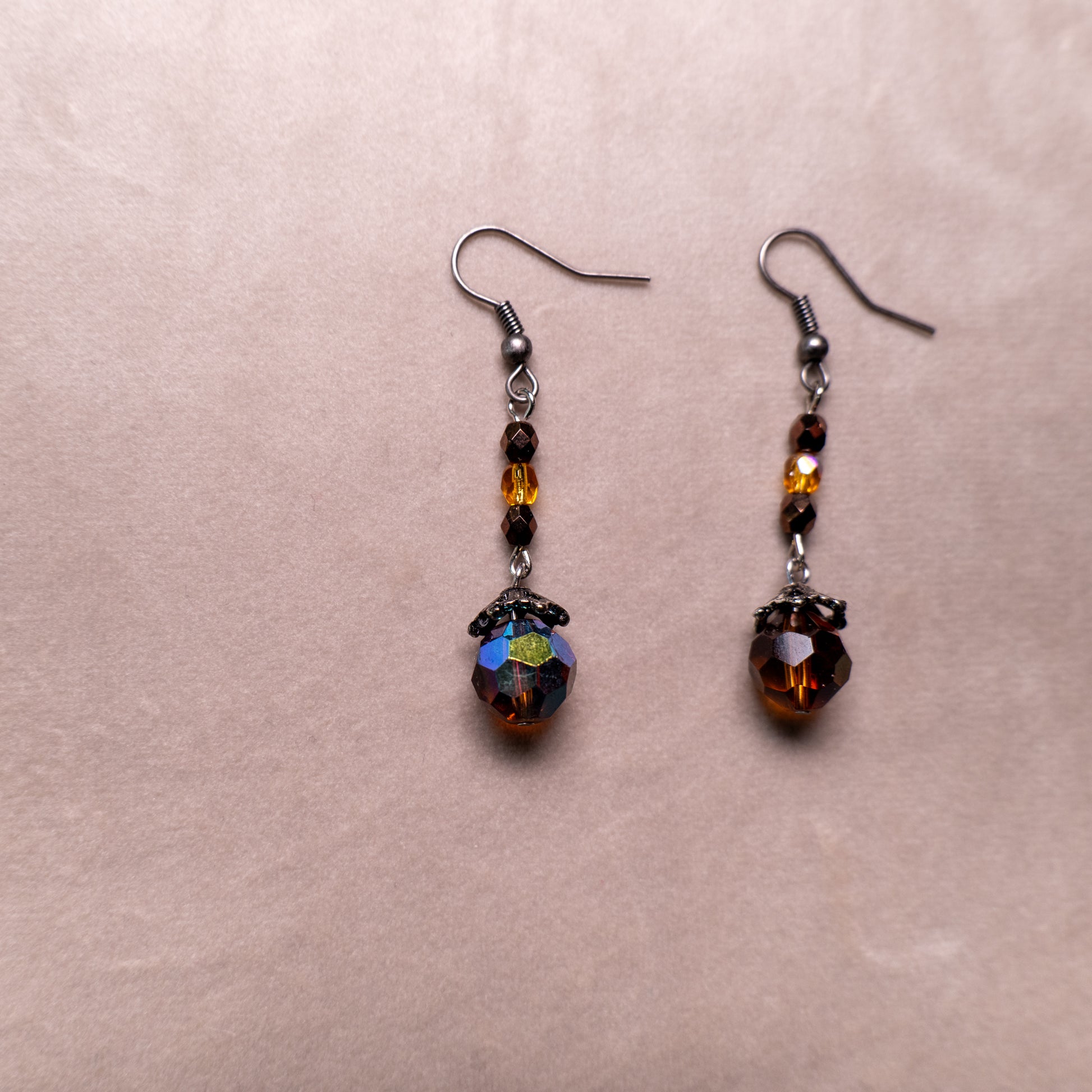 Deze oorbellen combineren warme ambertinten met glanzend koper en een diepbronskleurige kraal als blikvanger. Het kleurverloop geeft een mooi lichtspel, zeker wanneer de facetgeslepen kralen bewegen. De opengewerkte kralenkap voegt een klassiek accent toe, waardoor de oorbellen een sierlijke afwerking krijgen. Compact van formaat, maar met een rijke uitstraling.