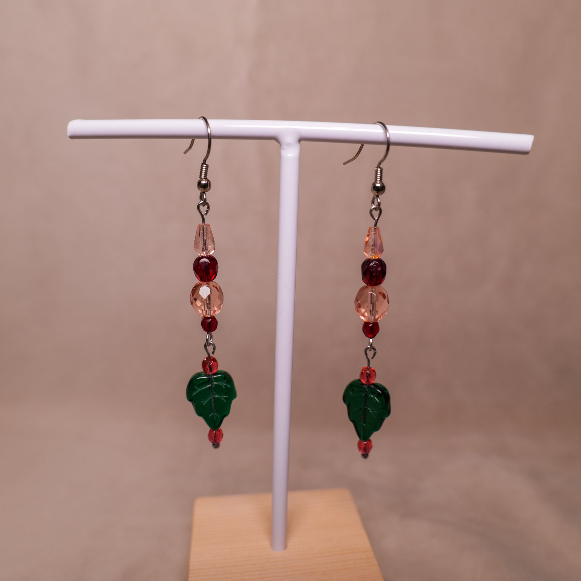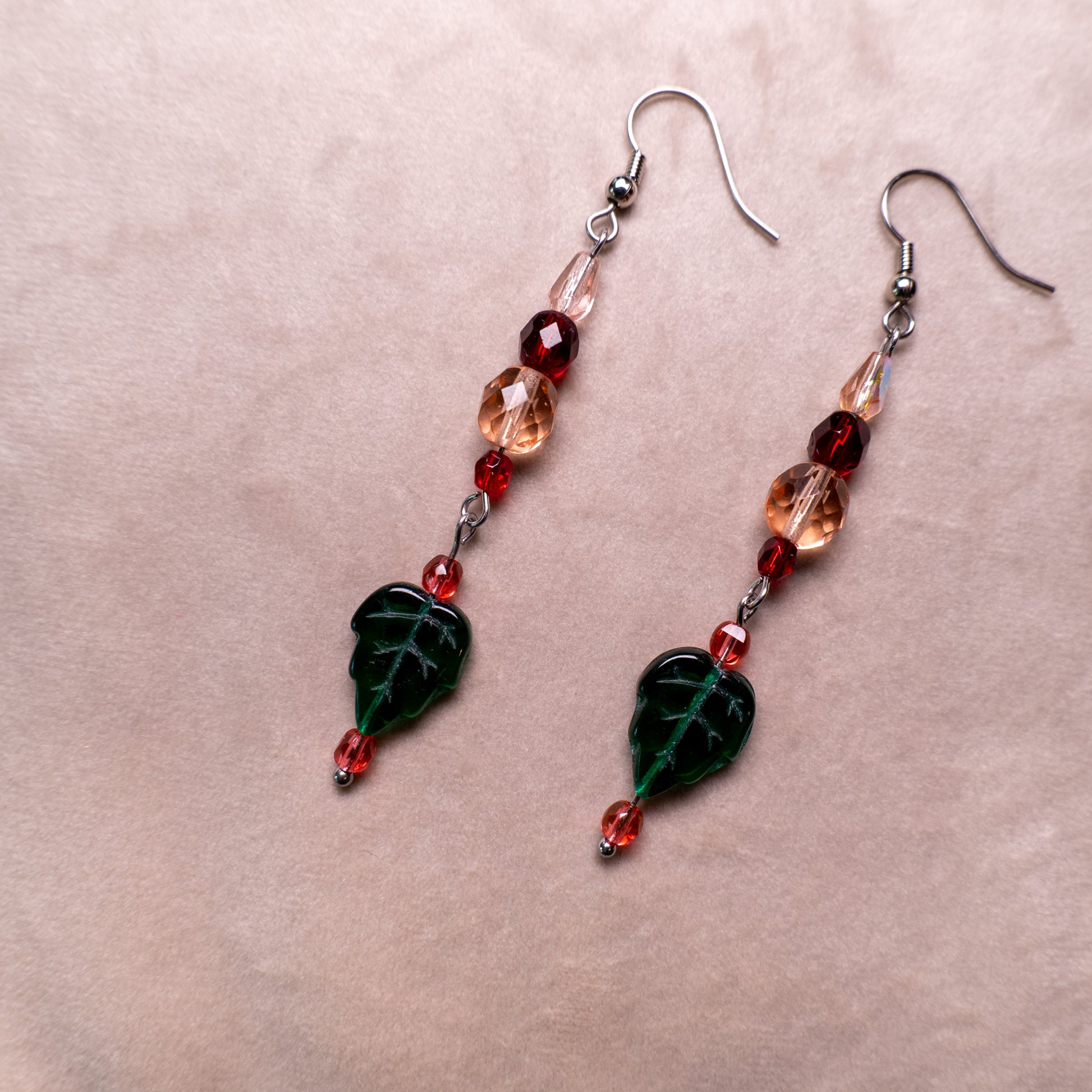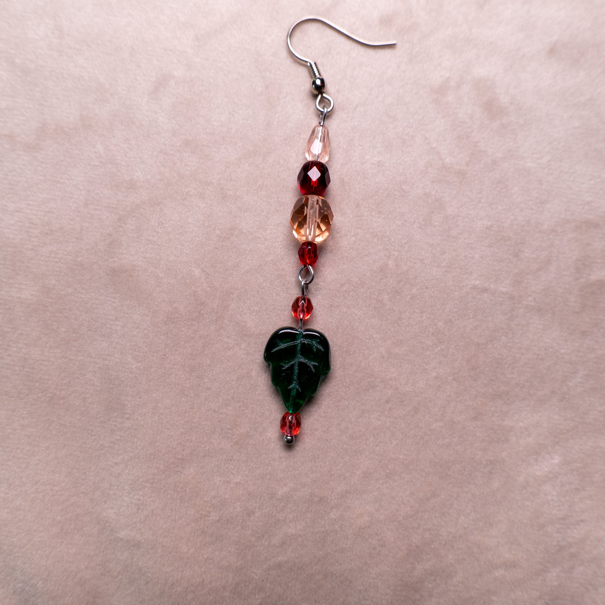 De combinatie van rood en donkergroen doet denken aan rijpend fruit of herfstbladeren in het zonlicht. De groene bladkraal onderaan geeft het ontwerp richting en karakter, terwijl de rode kralen daarboven zorgen voor ritme en glans. Deze oorbellen zijn ideaal voor wie houdt van sieraden met een natuurlijke uitstraling en een speels randje.