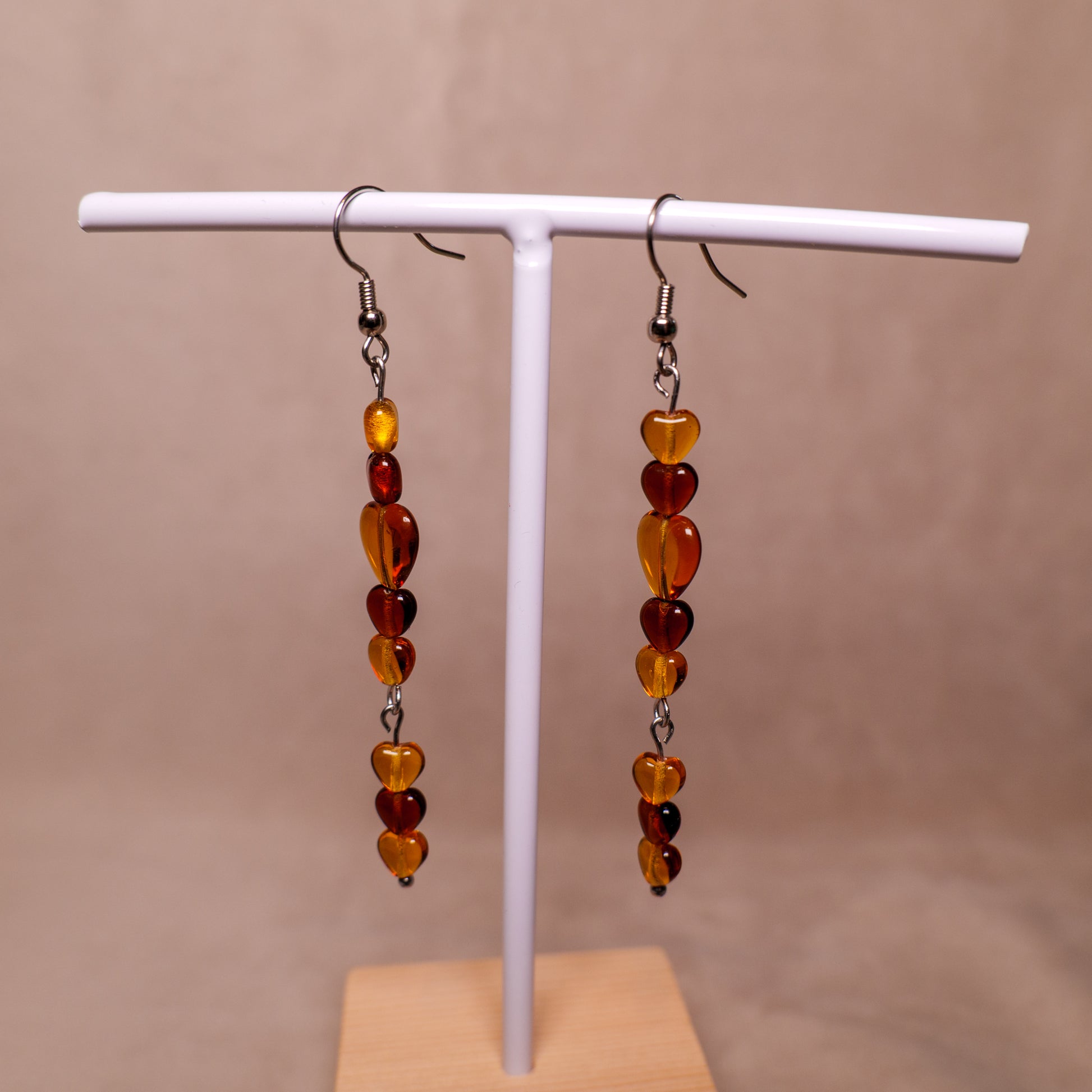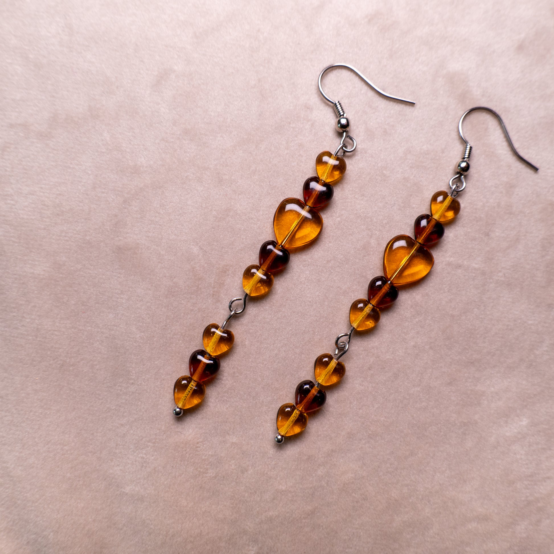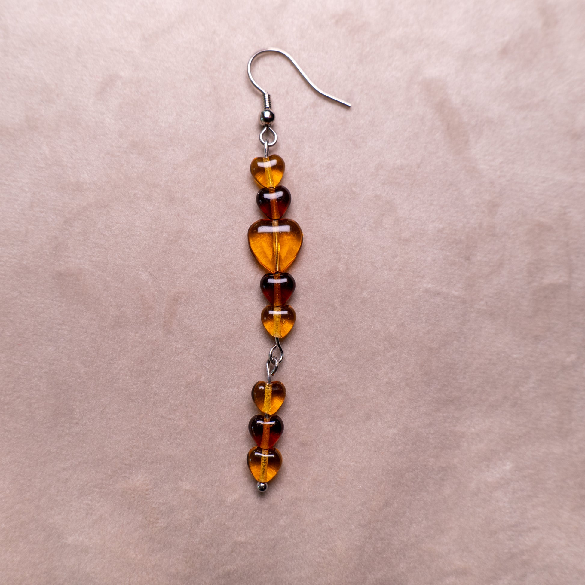 De kleurencombinatie van deze oorbellen doet denken aan amber, herfstbladeren en karamel. Het herhalende motief van de hartjes zorgt voor een speels ritme. Ideaal voor wie houdt van warme tinten, zachte glans en een vrolijke twist.