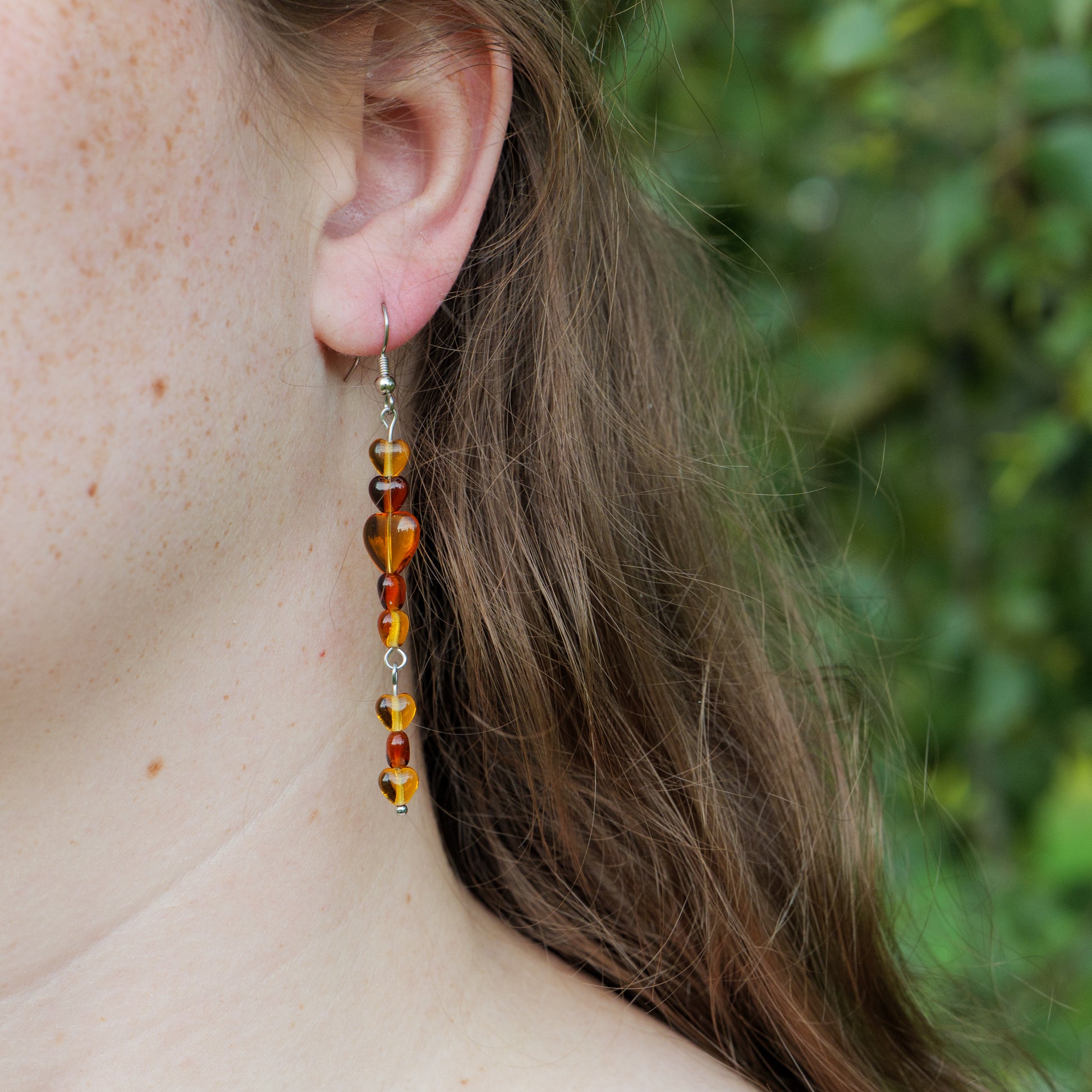 Deze lange oorbellen zijn opgebouwd uit glanzende hartkralen in warme bruin- en topaztinten. De kralen vangen het licht prachtig op en creëren een soepel lijnenspel langs je hals. Elke oorbel bestaat uit achter hartjes, met in het midden één groter hart dat het oog naar zich toe trekt. Je kunt kiezen uit twee varianten: met een groot oranje hart of een groot bruin hart. Beide versies hebben een warme uitstraling en zijn net verschillend genoeg om een eigen karakter te hebben. Deze oorbellen passen perfect bij de ketting met antiek koper rond ornament en oranje hartkraal, voor wie graag een bijpassende set draagt.