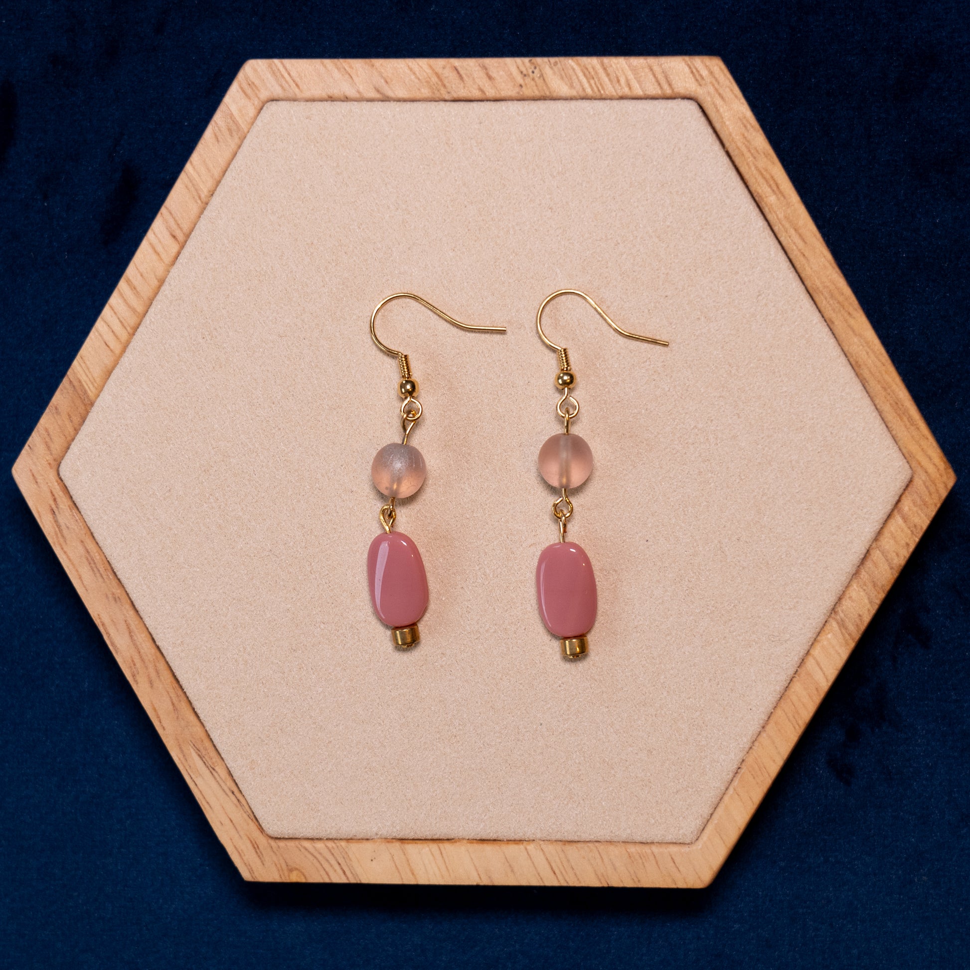 Deze korte oorbellen combineren zachte oudroze kralen met warme goudkleurige accenten. De bovenste kraal is mat glanzende, de grotere roze kraal komt in twee varianten: volledig egaal of met een gemarmerd effect. Beide versies zijn even elegant, maar elk met hun eigen uitstraling. Een fijne, lichtgewicht oorbel voor wie houdt van rustige kleuren en een vleugje vintage flair.