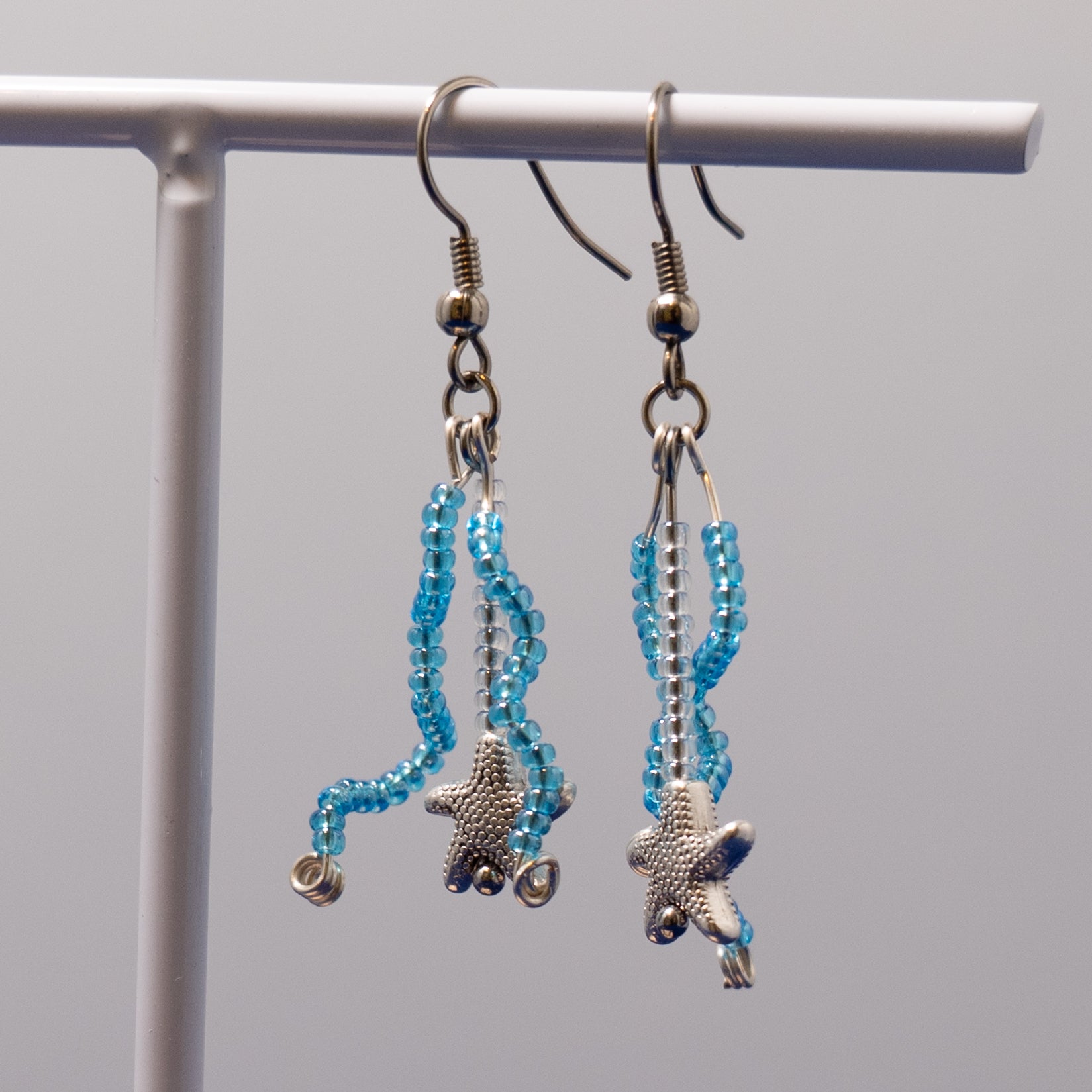 Elke oorbel is voorzien van een zilverkleurige zeester als middelpunt. Daaromheen kronkelen golven van kleine blauwe glaskraaltjes, die doen denken aan het zachte schuim van de golven van de zee.