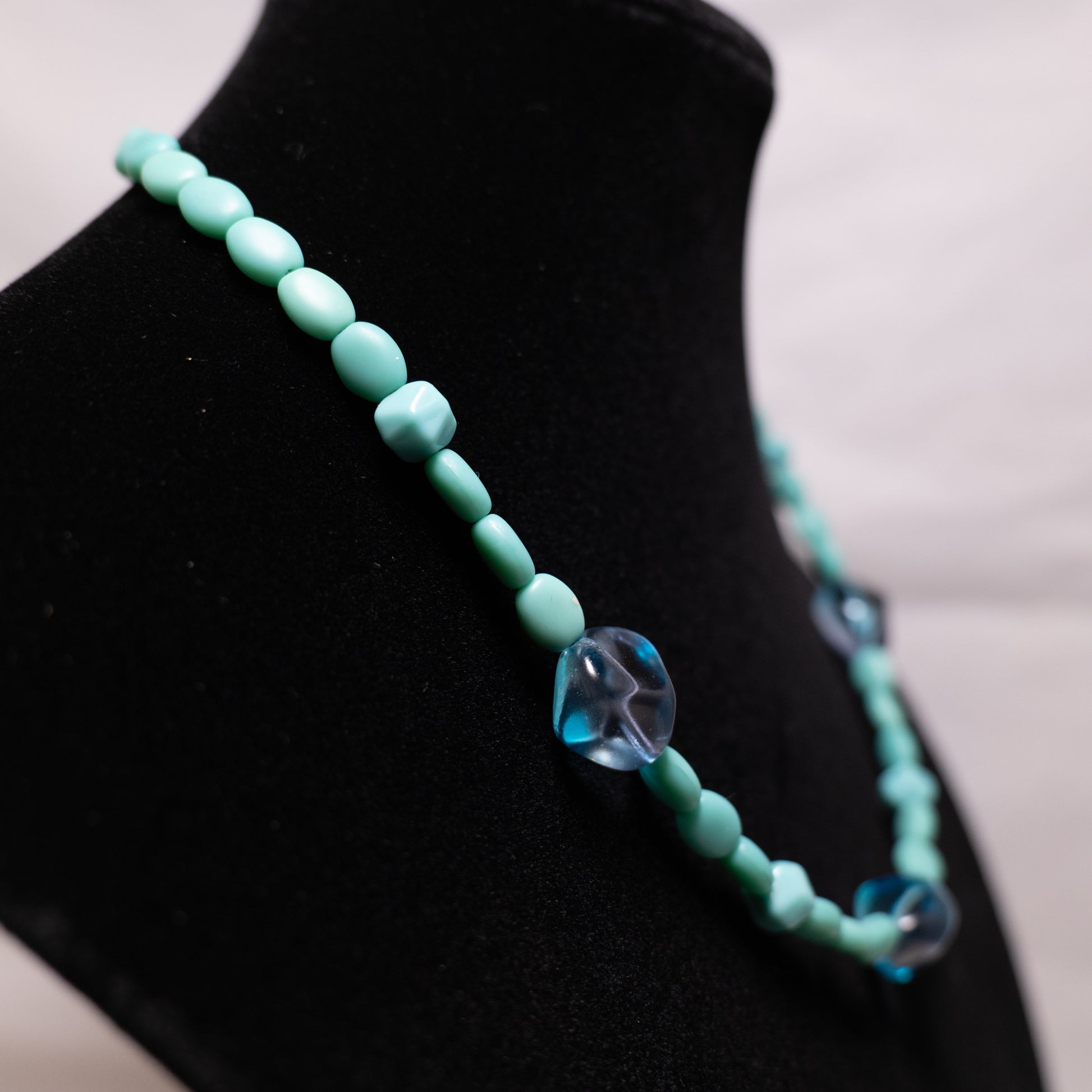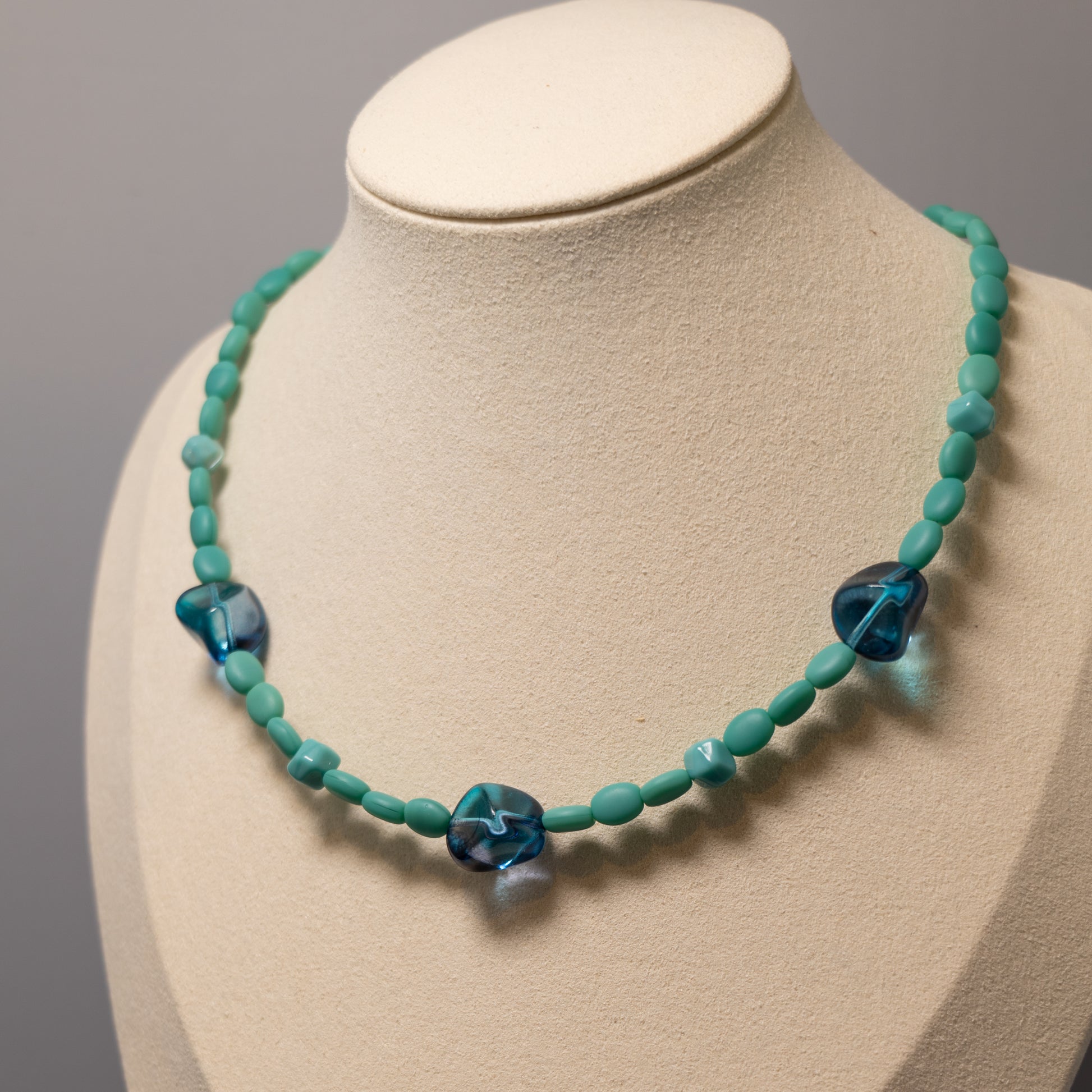 De ketting is samengesteld uit een reeks zacht turquoise, ovaalvormige kralen, afgewisseld met unieke lichtblauwe glazen kralen. Deze glazen kralen, met hun onregelmatige vormen en subtiele kleurschakeringen, lijken op door water geërodeerde edelstenen die langs de kustlijn te vinden zijn. De combinatie van de matte turquoise kralen en de glimmende blauwe elementen creëert een harmonieus en rustgevend geheel.